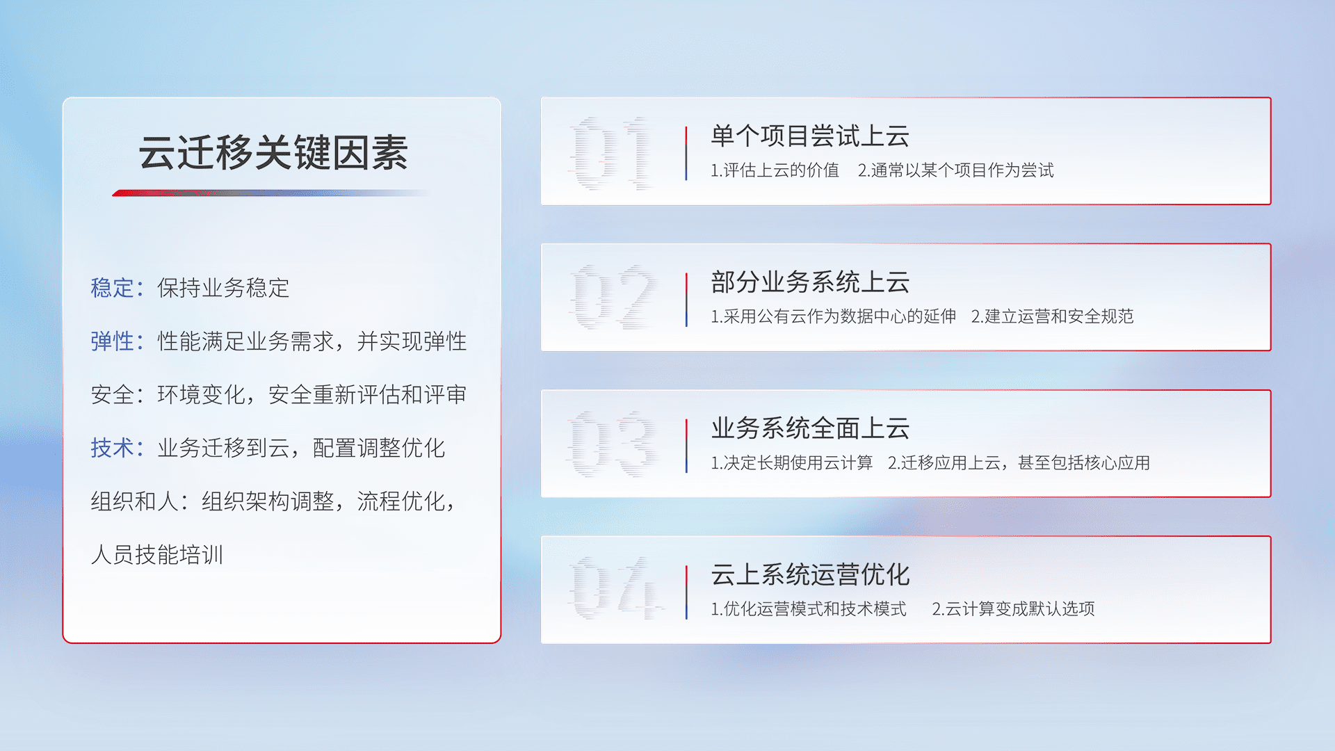 结合实际业务,,从规划设计、、、云平台选型、、、云原生改造、、、、数据迁移、、集成交付,,,迁移全过程为客户识别最佳上云路径,,,,做好风险识别管理,,,,设计网络架构、、、身份权限、、、、安全审计合规、、、操作审计、、日志审计、、、、监控告警策略、、多站点容灾设计等,,,,对云上基础设施进行整体规划,,,提升IT治理水平,,,以满足弹性、、、高可用、、高性能的需求。。。。