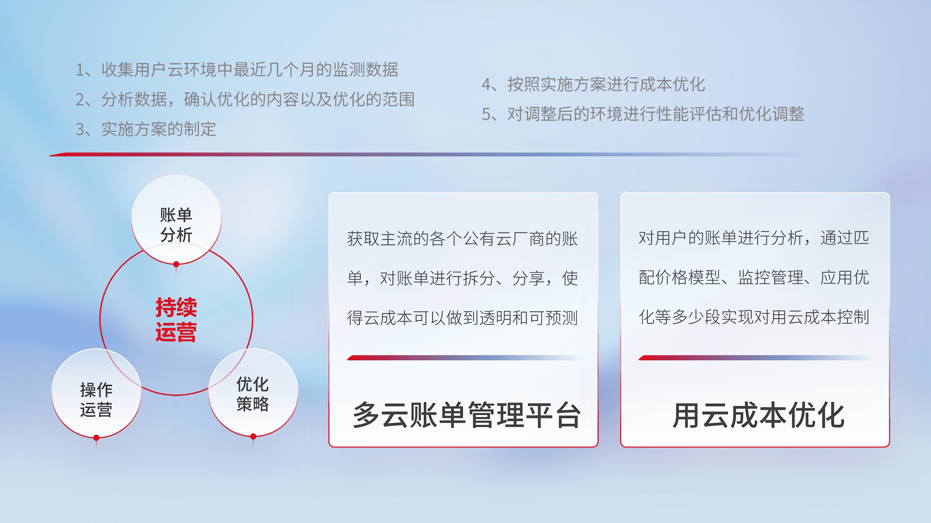 通过多云纳管,,,,以统一的资源数据模型把客户的云资源进行抽象和封装,,,,进而实现对多云资源的统一操作,,,,保障云资源管理的可靠性、、、稳定性与可用性。。。。量身定制化运维内容,,,配置、、、、开发运维、、补丁管理、、、备份、、、、监控、、、认证和访问管理、、审计和日常巡检等,,,保障在用云过程中的可靠度,,,,稳定度以及高可用率。。