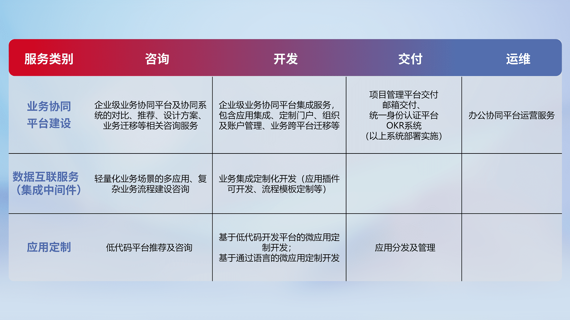 针对钉钉、、企微、、、IDaas等平台级产品提供产品的规划、、方案、、、、交付、、定制化开发等服务,,,,实现如统一协同办公、、智能客户服务、、、、混合会议管理、、智能数据查询、、等业务场景,,,,实现数字化转型。。。